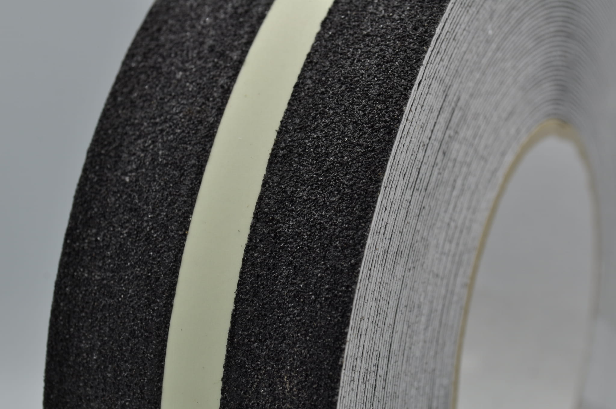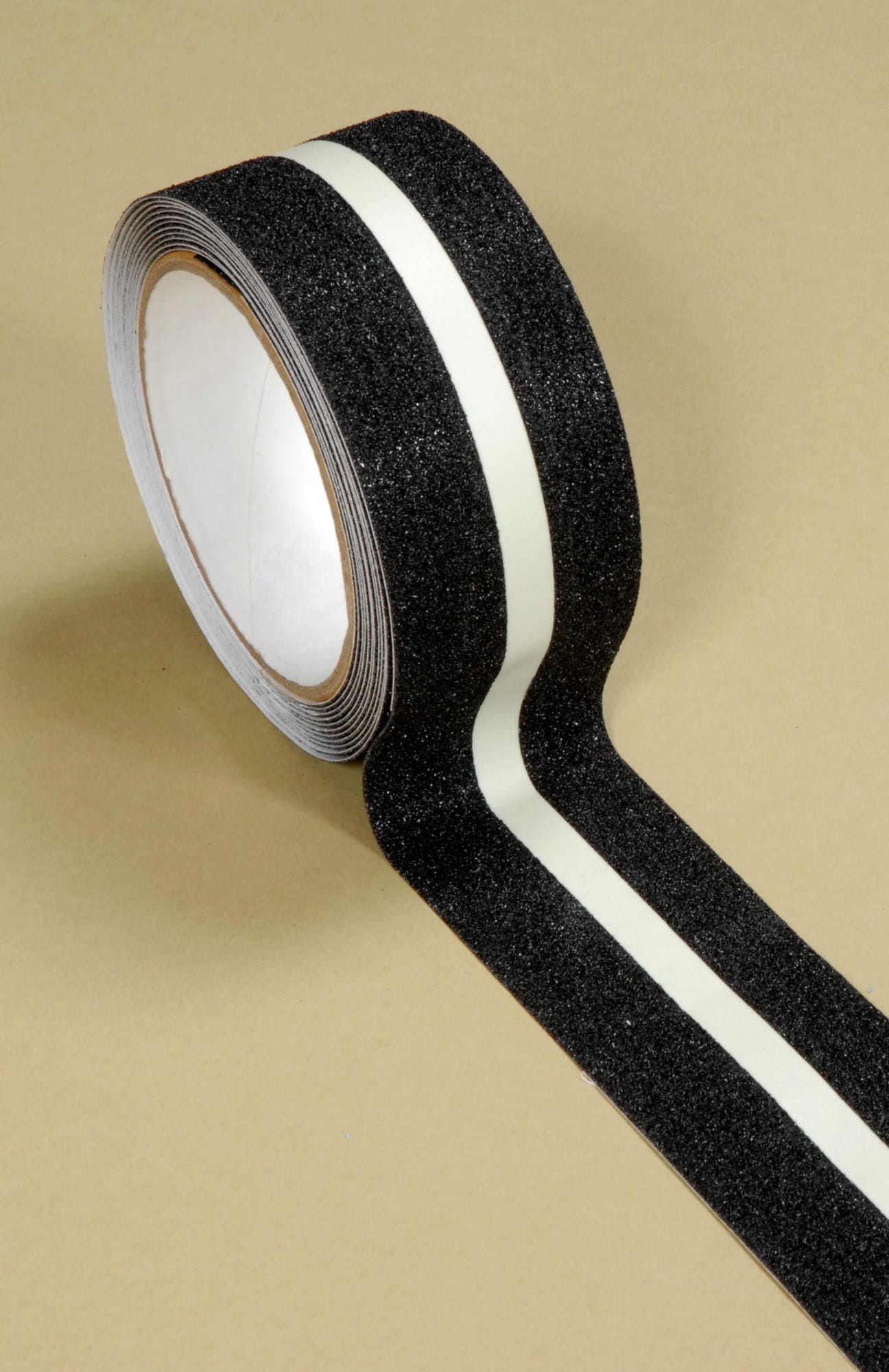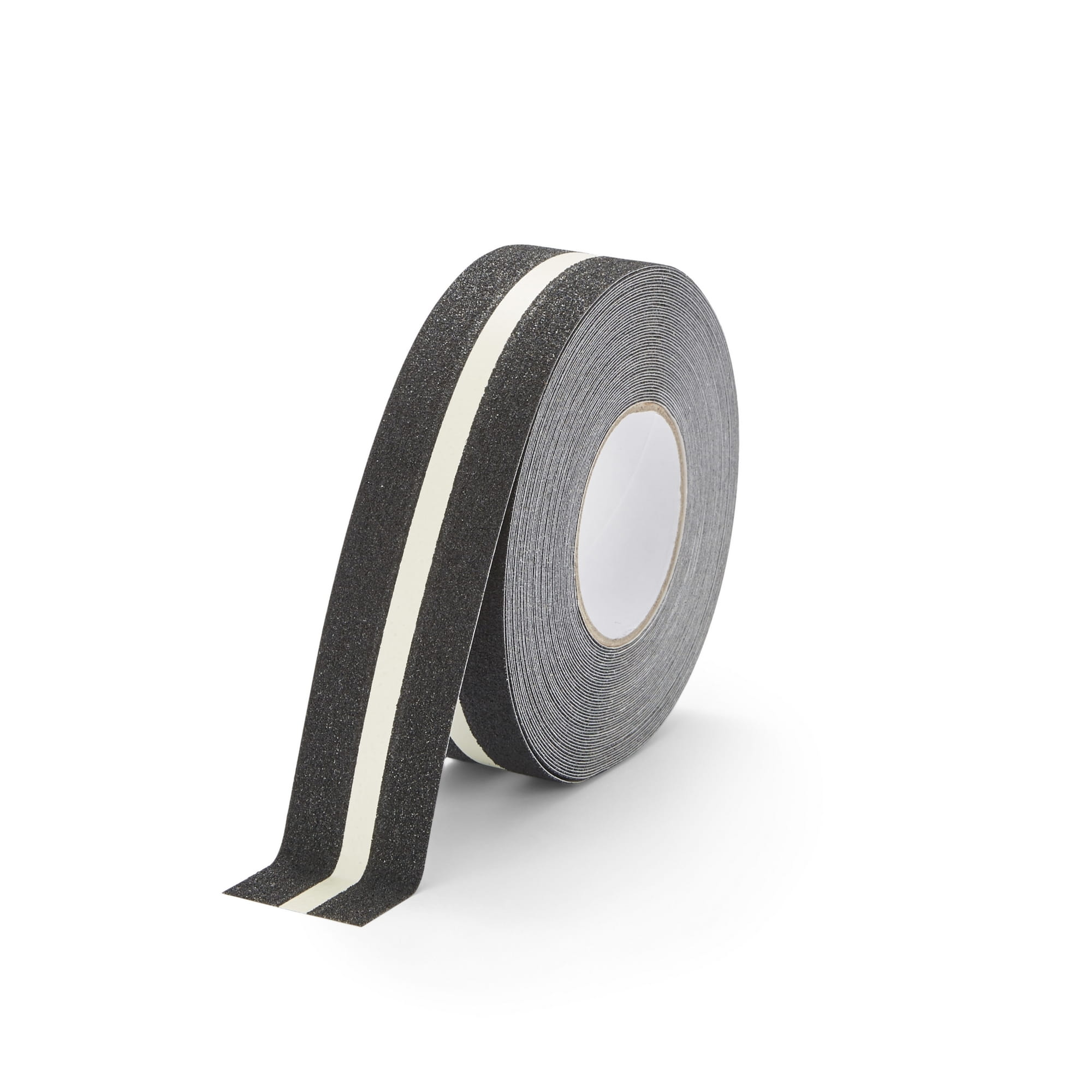 Samoprzylepna, pokryta minerałami ściernymi taśma antypoślizgowa Safety-Grip™ świecąca w ciemności, z fotoluminescencyjnym, estetycznym paskiem. Najczęściej stosowana do schodów.
